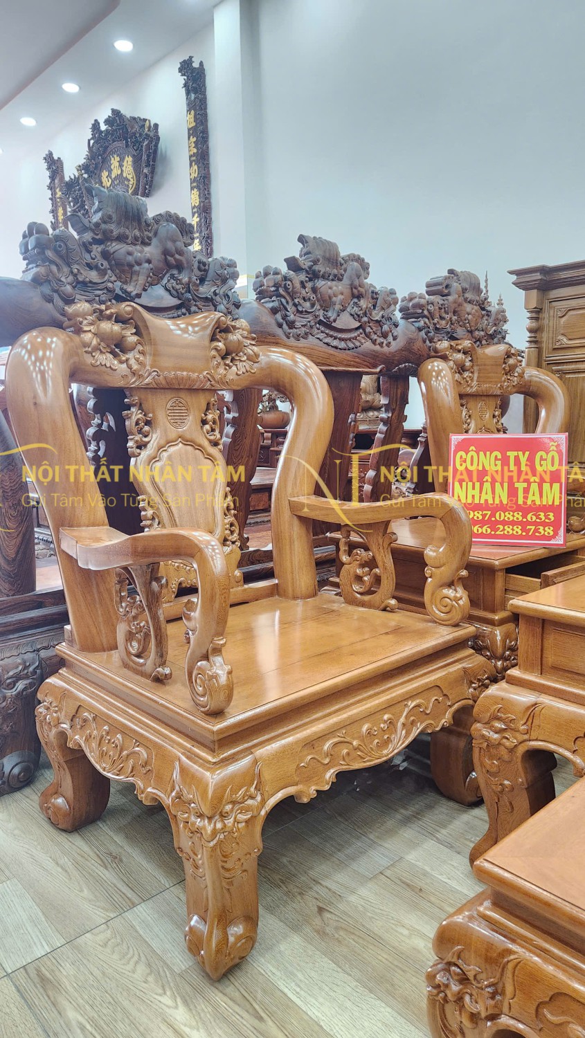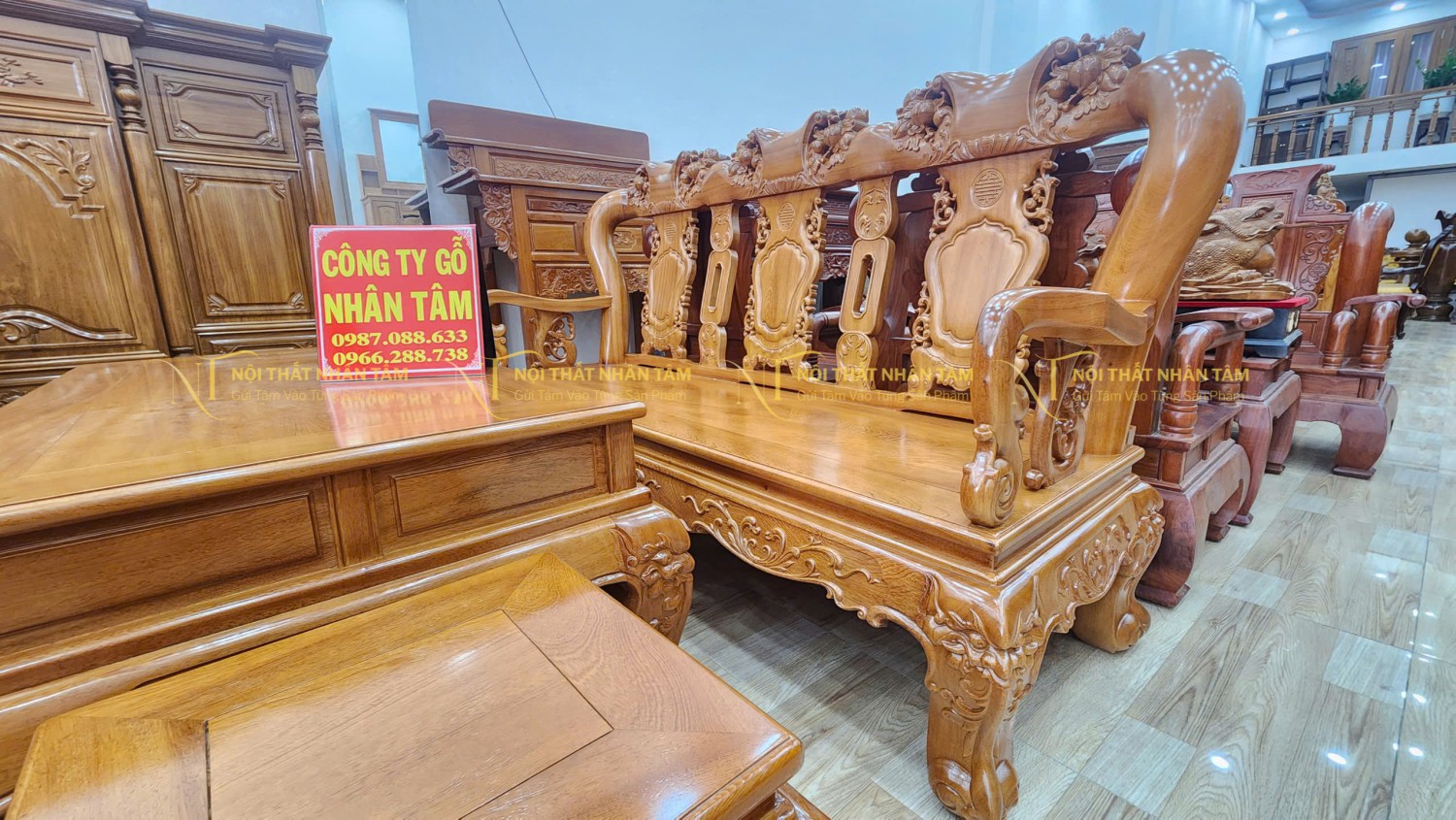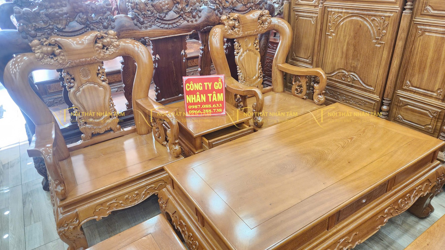 Điểm nhấn nổi bật của bộ sản phẩm nằm ở thiết kế tay 12 vô cùng chắc chắn, tạo nên cảm giác mạnh mẽ và vững chãi cho toàn bộ kết cấu. Các nghệ nhân đã kỳ công chạm khắc họa tiết đào – biểu tượng của sự trường thọ, cát tường và may mắn. Hoa văn được thực hiện hoàn toàn thủ công, sắc nét và tinh tế, thể hiện rõ độ sâu của đường chạm cùng tính thẩm mỹ cao. Phần tựa lưng form cao tạo dáng thanh thoát nhưng vẫn giữ nét uy nghi, mang lại sự thoải mái khi tựa và một tổng thể hài hòa cho phòng khách.