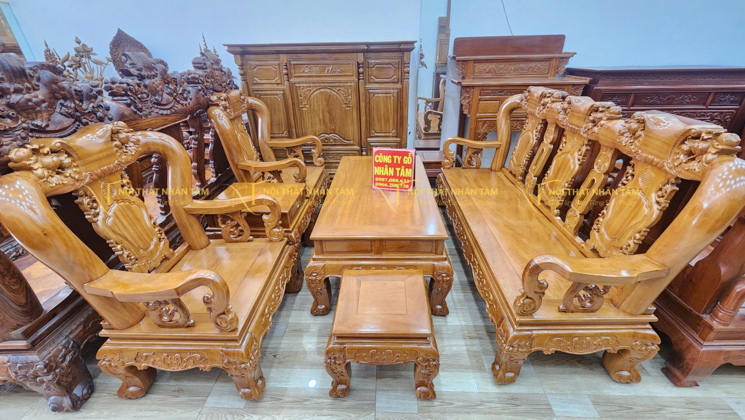 Bộ salon gồm 6 món: ghế dài, các ghế đơn, bàn lớn, bàn nhỏ… tất cả đều được làm đồng bộ từ gỗ gõ đỏ, đảm bảo sự thống nhất về màu sắc và kiểu dáng. Bàn được thiết kế dáng vuông vức, mặt rộng, chân chạm hoa tinh xảo, phù hợp để tiếp khách, trưng bày vật phẩm hoặc tạo điểm nhấn cho không gian. Từng góc cạnh đều được bo tròn tỉ mỉ, tạo cảm giác mềm mại nhưng vẫn không mất đi sự mạnh mẽ vốn có của gỗ gõ đỏ.